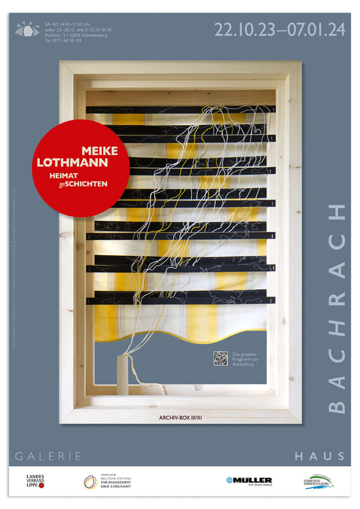 Ursprünglich aus der ländlichen Tagebauregion Garzweiler II am Niederrhein kommend, lebt Meike Lothmann nach ihrem Kunststudium an der Akademie der Bildenden Künste Maastricht / NL und Stationen in Berlin und Essen seit 2014 in Schwalenberg / OWL. Die Ausstellung analysiert Schichten innerer und äußerer FORMEN des Lebensraums HEIMAT. Erinnerungen der Kindheit, gefunden in der Verlassenheit ihres Heimatortes Keyenberg werden zu bewahrenden Installationen, die von Verlust und Zerstörung als Hinterlassenschaften des Tagebaus Garzweiler II erzählen.